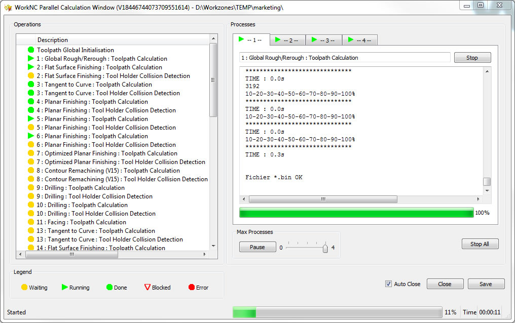 S dostupným výkonem dnešních pracovních stanic umožňuje pokročilé paralelní zpracování uživatelům vypočítat až 4 dráhy nástrojů současně v každé projektu. To znamená méně času sledování výpočtů a více času získávání dráhy nástrojů. Tato funkce je součástí všech licencí CAM s aktuálním maintenance.